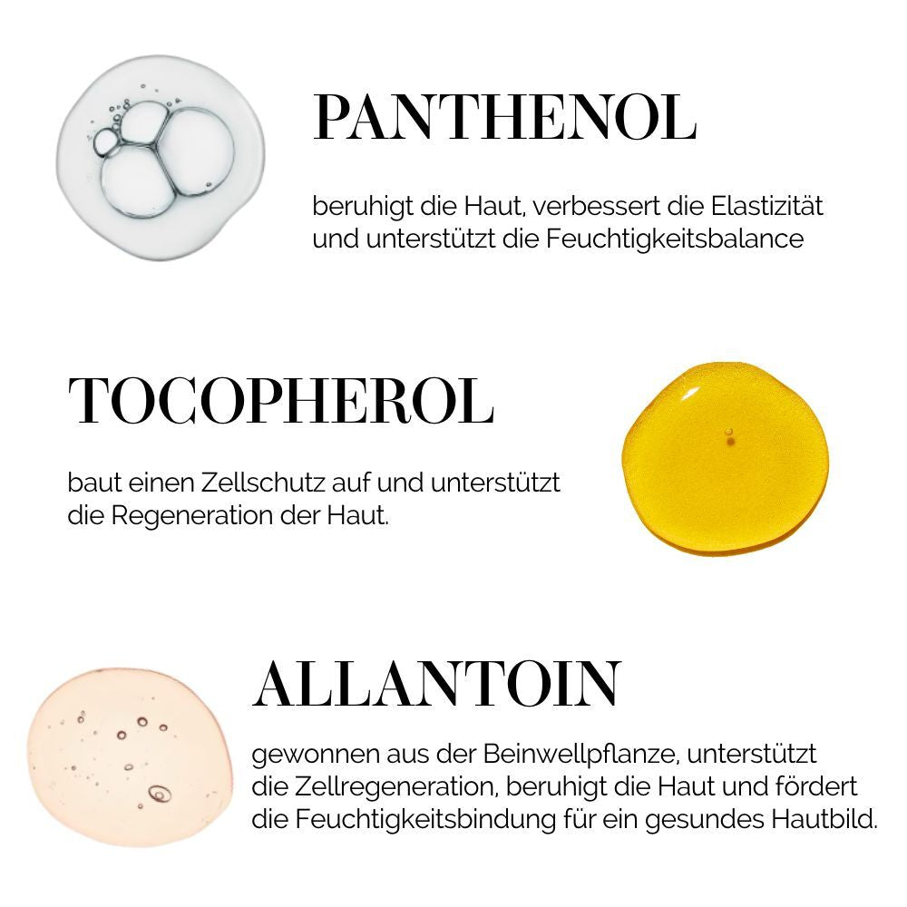 ✅ Panthenol & Allantoin: Diese beruhigenden Inhaltsstoffe fördern die Heilung von gereizter Haut und sorgen für ein samtig weiches Hautgefühl.